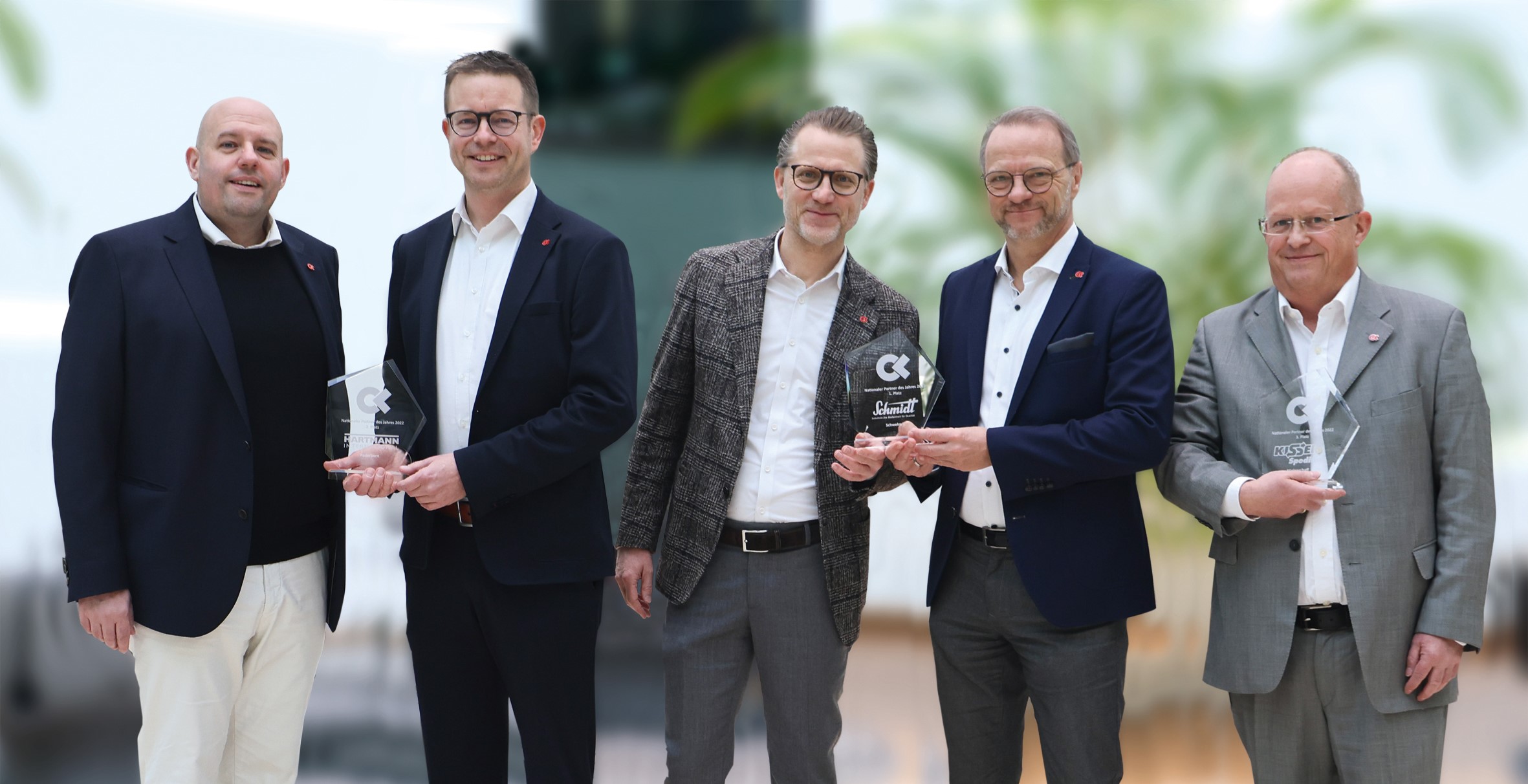 (V. l. n. r.): Die Geschäftsführer Björn Böhme und Uwe Lachmann von Hartmann International (Paderborn), Torsten Huberti und Burkhard Frese von Schmidt-Gevelsberg (Schwelm) und Stefan Kissel von Kissel Spedition (Mainaschaff) freuen sich über die Auszeichnung ihrer Unternehmen als „CargoLine-Partner des Jahres 2022“.